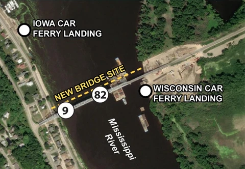 The Iowa and Wisconsin Departments of Transportation are partnering to offer a free car ferry across the Mississippi River during the closure of the IA 9 / WIS 82 bridge. This service connects Lansing, Iowa, with Wisconsin near De Soto and Ferryville while the new bridge is under construction.
