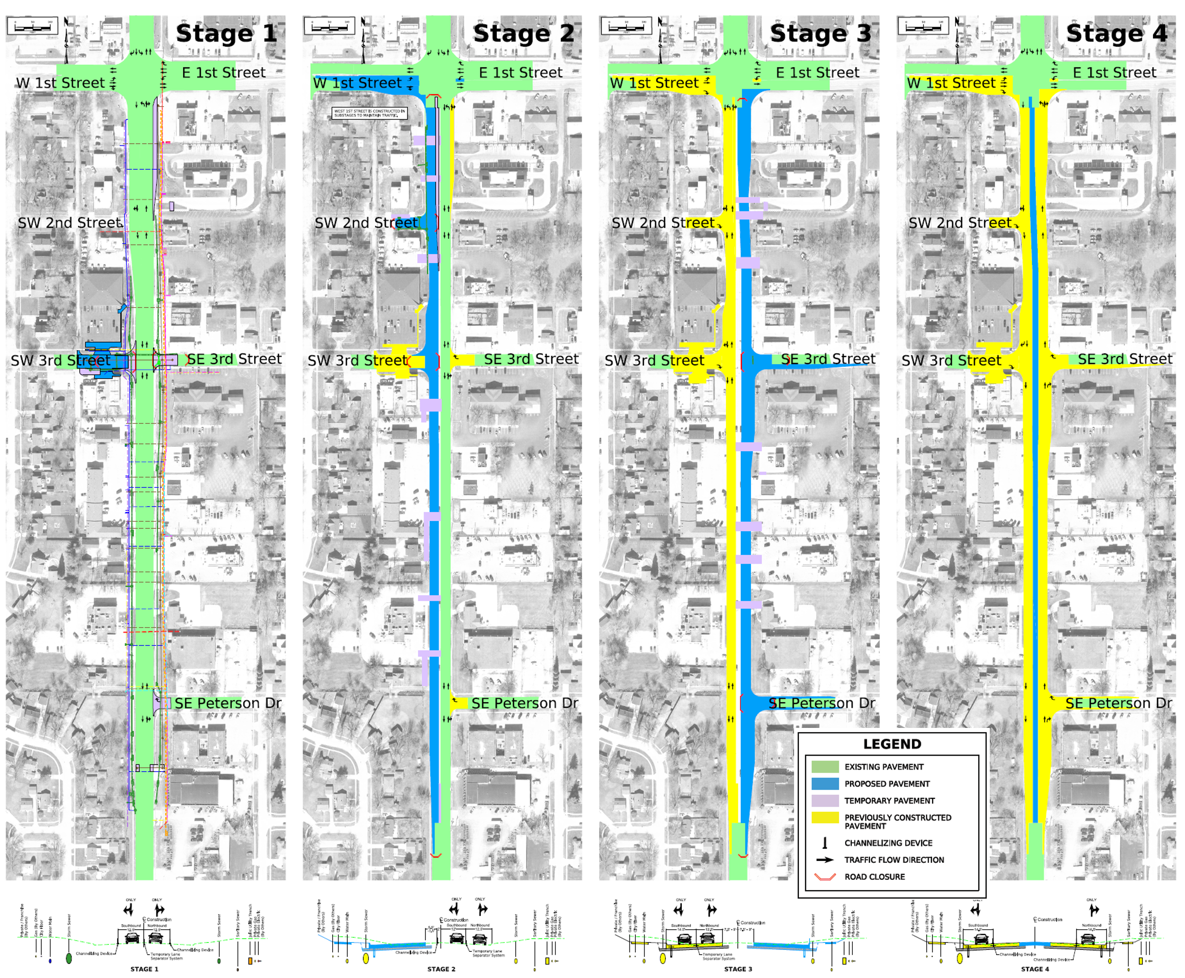 - Traffic will be shifted to the inside lanes while utilities including water and sanitary sewer are moved on the east and west sides of the road. There will also be new pavement constructed on 3rd Street.